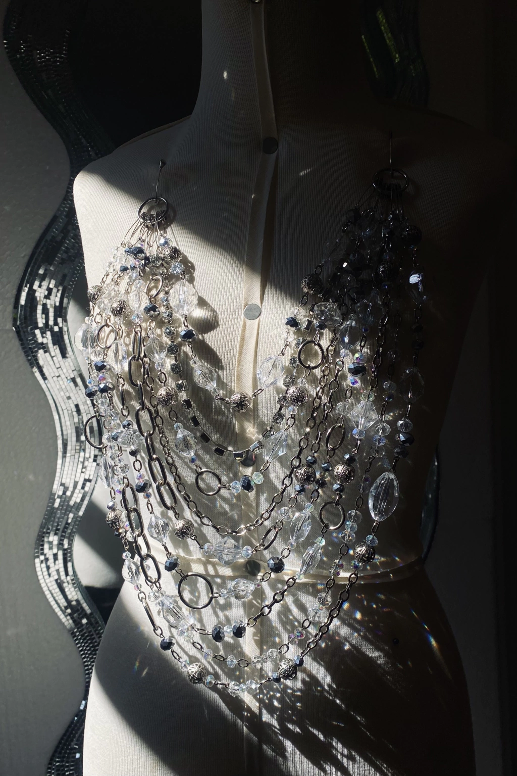 Top de correntes em metal com strass, cristais e elos. Costas abertas com fecho posterior.